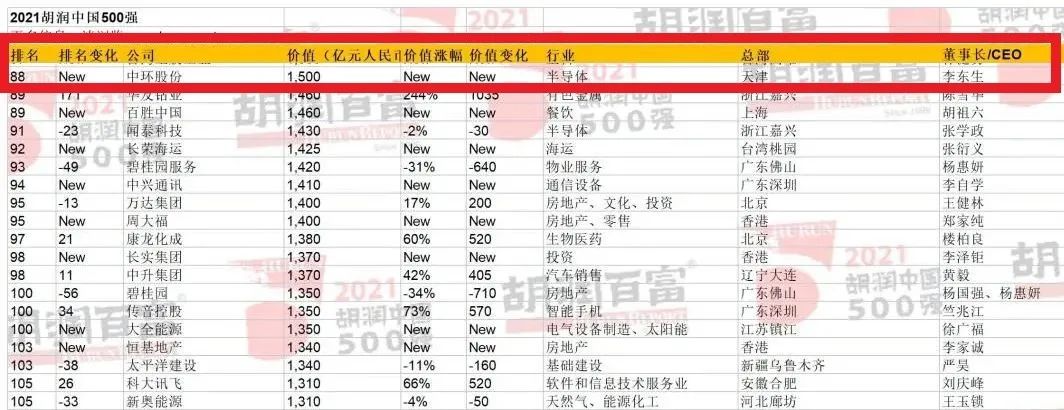 胡潤百富新秀 | 中環(huán)半導體登榜2021胡潤中國500強,位列第88名